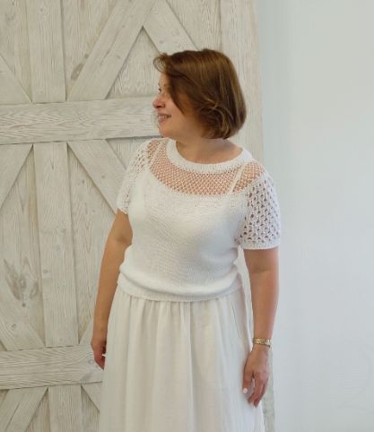 Джемпер c коротким рукавом, выполняется сверху вниз (вязание от кружева в обе стороны). Пройма реглан, на рукавах ажурный рисунок.